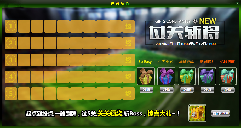 活动内容:在活动期间内,玩家参与“过关斩将”活动。过关斩将好玩的不得了,该活动从入口开始翻牌,每翻一张牌仅需50金币,如果翻出的是道具可直接获取,如果是拦截球队则要战胜这支球队或者消耗200金币跳过这支球队才能继续翻牌。成功闯关的玩家能够领取闯关大奖礼包咧,5关全过就可以冲击大奖,就可以挑战终极BOSS,如果挑战成功则可以领取“过关斩将大宝箱”哟~重翻次数卡*20、巅峰回豆卡*5、教练经验卡10000点*10、银币双倍卡*10、立即返回卡*50、白金钥匙*5等你拿!