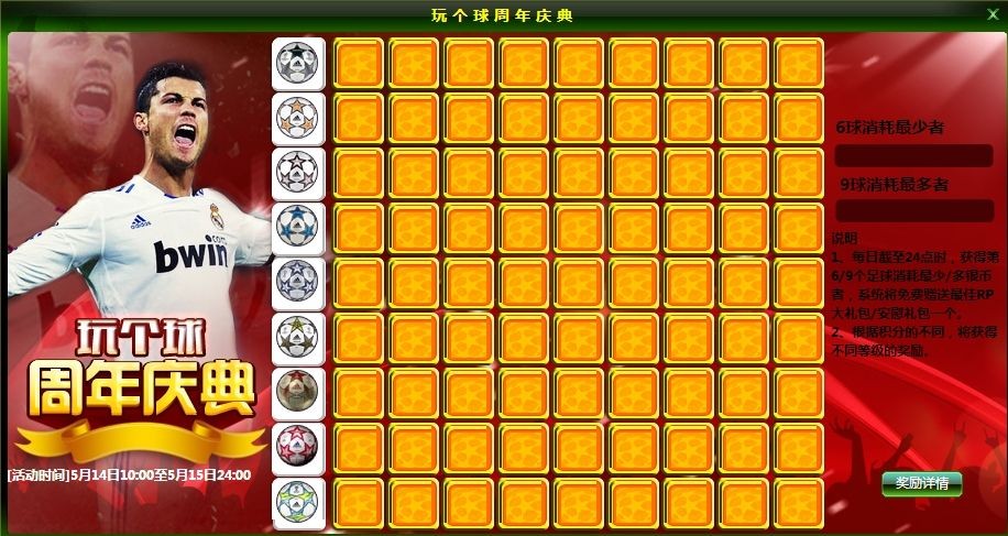 3、活动期间,每活动日截止24:00时,翻得第6个球消耗最少银币者,系统将免费赠送最佳RP大礼包,礼包内含:7级合同一个,5级装备套一套,战术积分卡10000点。同时,获得第9个球消耗最多银币者,系统将免费赠送消费礼包,礼包内含:球员经验卡10000点,训练卡100000点,战术积分卡10000点,袖标5级*1。最佳RP礼包及消费礼包会直接发放到符合条件的玩家背包中。