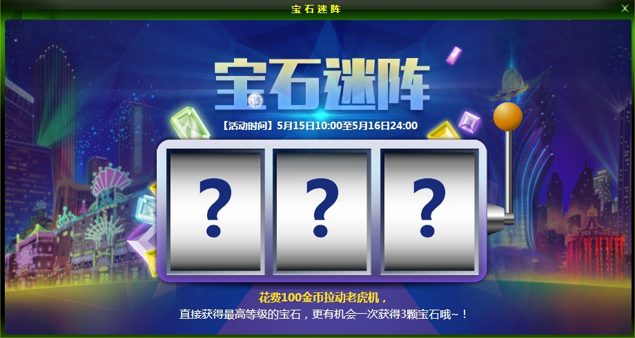 玩家每次花费100金币拉动拉杆,然后从抽出的3种宝石中获取其中等级最高的宝石。例如:有1颗2级宝石2颗1级宝石,则获得1颗2级宝石;有2颗2级宝石和1颗1级宝石则获得2颗2级宝石。