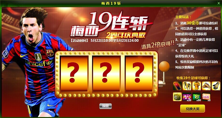 1、玩家参加梅西十九连斩活动费用为30金币/次。如随机摇出3种不同道具,玩家可领取其中一款道具;如随机摇出两个以上相同道具,玩家可选择将相同的道具全部领取。