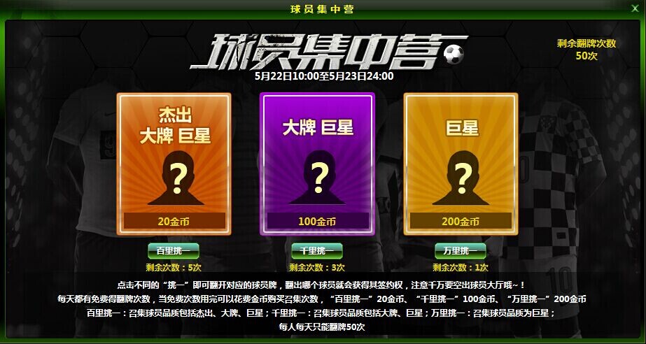 活动内容:在活动期间,“球员集中营”惊喜送上!玩家可有免费的机会在“百里挑一”、“千里挑一”、“万里挑一”翻牌获得随机品质球员的签约权。令你百感交集的球员集中营让你挑上瘾,每天免费挑选的次数可有限,欲罢不能时花点金币也可以挑!杰出,大牌,巨星球员要来验验你的手气了!