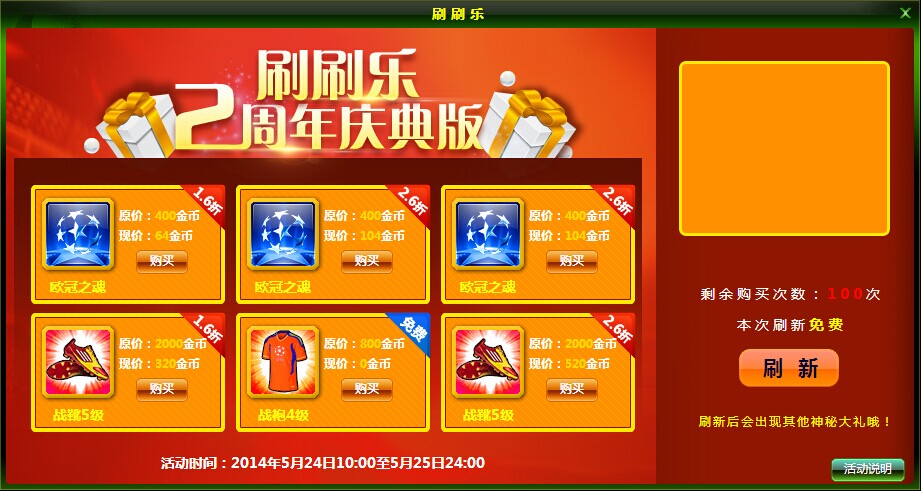 1、活动开启后,玩家点击“刷新”按钮可刷出6款随机道具及随机折扣,玩家有可能刷出免费购买道具的机会。