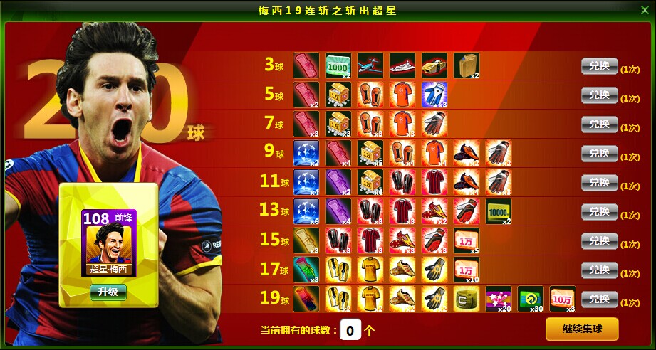 温馨提示:活动期间不设重置即不会清除当日玩家所获足球,每人每天一种奖励只能兑换一次。活动期间,金球·梅西只能升级一次,升级扣除足球。