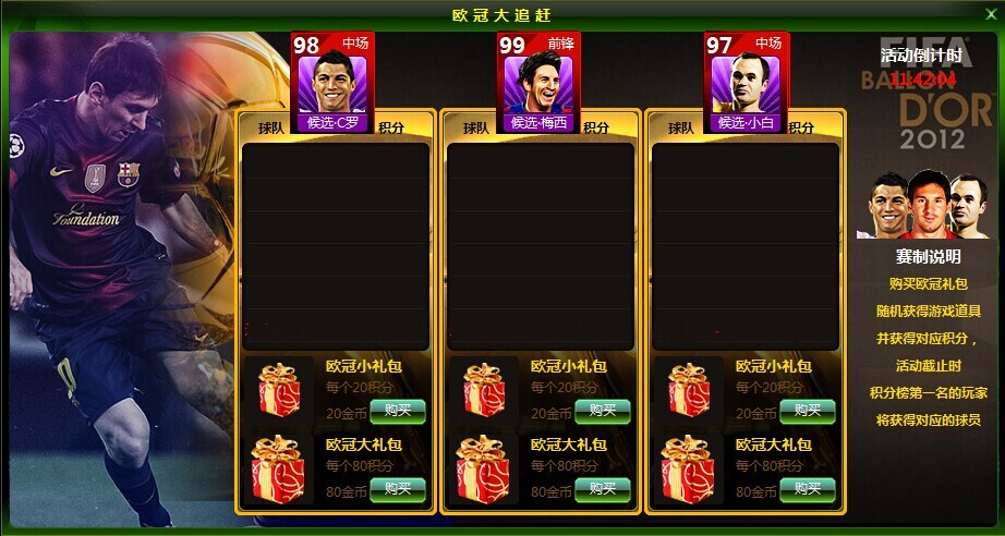 活动内容:活动期间内,在活动界面内购买礼包,不仅可随机获得合同、教练合同、球员经验卡、教练经验卡、5级装备、欧冠之魂等道具材料,购买礼包还可获得积分,活动截止时积分榜状元可获得金球候选大牌哟!不要忘了拥有三位候选大牌可以合成初始能力105巨星金球梅西哦~^_^