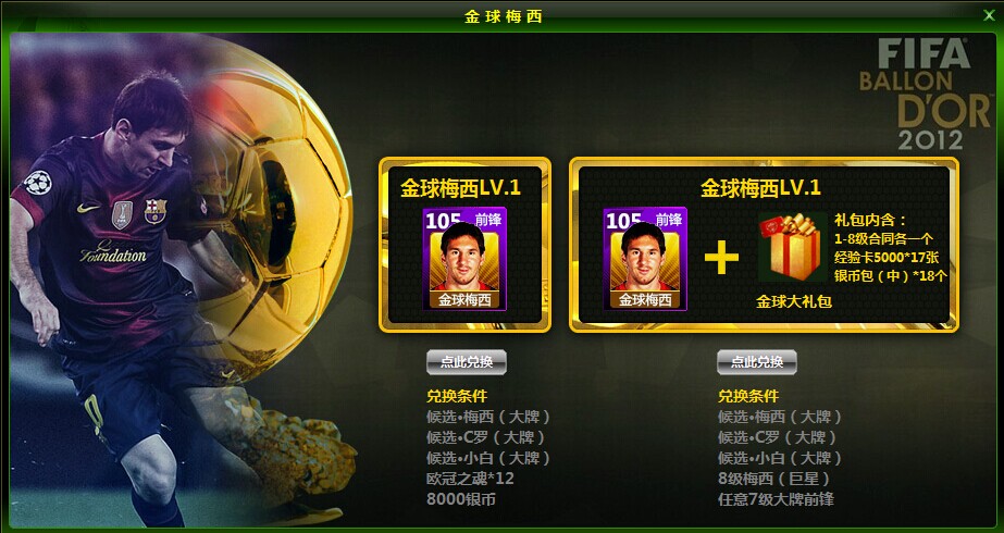 兑换需满足条件:候选•梅西、候选·C罗、候选·小白, 12枚欧冠之魂,8000银币。