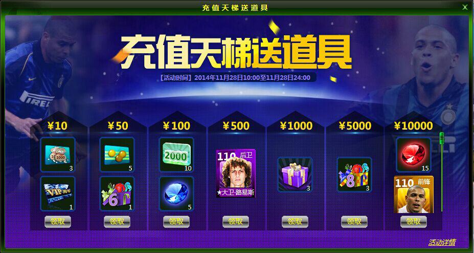 活动期间单笔充值达10000元,奖励道具为:5级宝石*15,球员传奇罗纳尔多,罗纳尔多签名套装1套(非袖标+300、袖标+200)。