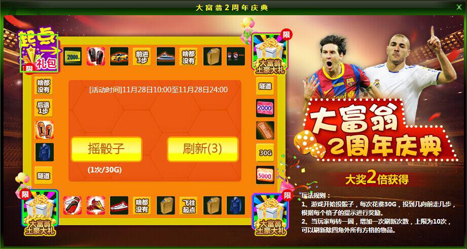 活动内容:在活动期间内,玩大富翁仅需消耗30金币即可掷1次骰子,骰子显示几点就走几步。各种妙礼遍布在你的大富翁梦想之路上。大富翁角落大奖除了起点礼包,其余三个角落大奖每个角都有1-9级合同,6级装备套,6级袖标,训练赛回豆卡*5,高级教练合同1-9级,好运卡*10。玩家每次走到角落大奖时,所获得的礼包数*2(含起点礼包),角落大奖单服领取数量有限。大富翁,即刻出发!