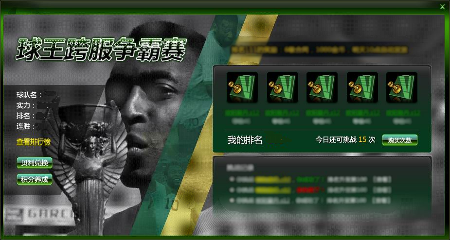 2、当球王跨服争霸挑战赛开启后,系统会随机匹配5个对手供玩家挑战,挑战完5名对手即自动进入下一组,每天可免费挑战15次,当免费挑战次数用完,玩家每天还可最多购买30次挑战次数,每购买一次需花费100金币。