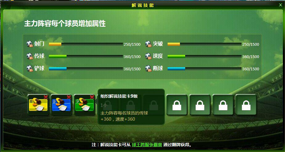 解说的等级越高,则实力加成就越高,可开启的解说技能开槽也就越多。在跨服球王争霸赛中可有机会获得潜力卡,解说经验卡,解说技能卡。