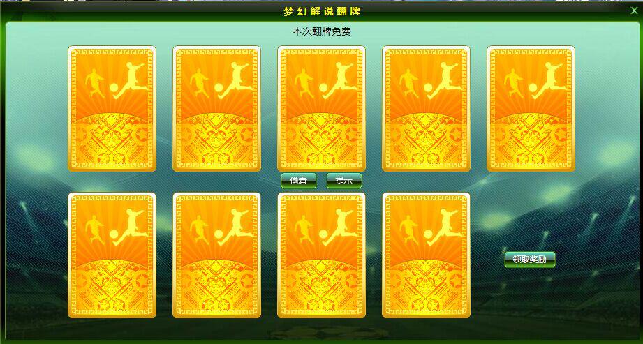 当玩家游戏等级达到65级,可在球王跨服争霸赛中,每天完成6场挑战赛后(无论胜负),通过翻牌可有机会获得解说技能卡。翻牌时,一共有9张牌,玩家可免费选择2张翻取,剩下的牌则需要消耗金币翻取,当然玩家也可以花费相应的金币来进行提示一张,偷看一张。每日24:00重置翻牌。