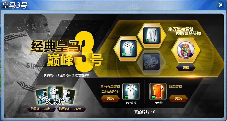 活动内容:在活动期间,玩家参与“皇马新3号”活动!玩家通过精英赛获胜可获得“3号碎片”,也可在活动界面中消耗金币购买“3号碎片”。当玩家收集到一定数量的碎片就可以在活动界面中兑换球员装备。可兑换的装备有球员4级装备和全服限量10个的皇马5级球员装备。集齐后卫皇马5级装备一套,就能免费领取新款皇马队徽头像奖励!