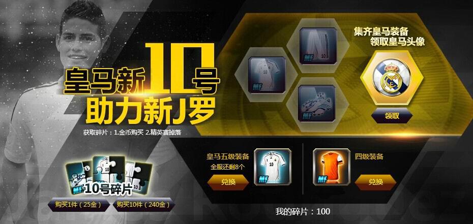 活动十六:皇马新10号助力新J罗 中场皇马5级装备全服限量大抢兑