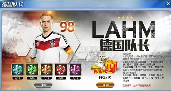 活动内容:在活动期间,玩家可通过挑战赛、天梯赛、联赛、精英赛、以及球会任务获得荣耀之魂、竞争之魂、勇气之魂、智慧之魂、征服之魂,亦可通过活动界面购买礼包获得,礼包还可开出超值道具;当玩家将五种魂都集够一定数量(19个)时,可将93拉姆升级为98拉姆。升级过程中保留球员等级。