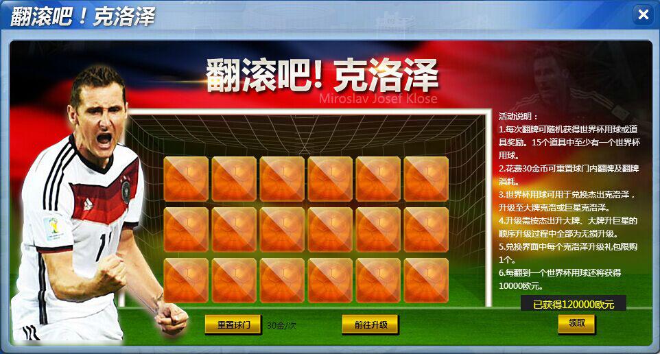 活动内容:在活动期间,尽情参与“点球大战”活动,界面中球门区有18张卡牌,翻牌可随机获得道具,若是玩家翻牌获得世界杯用球,当收集一定数量的世界杯足球可以对克洛泽品质进行升级。每次翻牌分别从最低2000欧元至最高100金币。尽情翻牌,尽情收集世界杯用球,最高可将克洛泽升级至巨星品质哟~在活动界面中,更有克洛泽升级礼包限量发售呢~克洛泽创纪录,史无前例哟~快快参与其中,巨星克洛泽一定会让你火上火!