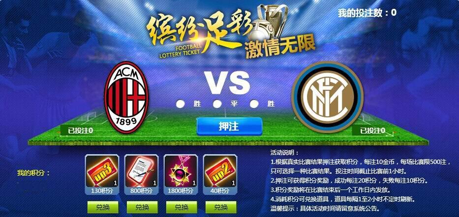 温馨提示:AC米兰与国际米兰的比赛竞猜截止于开赛前1小时哦,可不要错过这次大赚积分兑换极品道具的机会!酝酿过后,请赶紧投注!