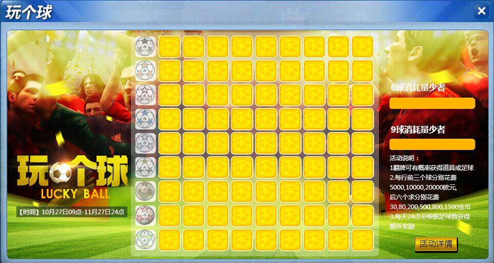 活动内容:在活动期间参与“玩个球”活动。81张幸运卡片等你翻,每组都暗藏一颗对应花色的中奖彩球,玩家消耗欧元或金币翻牌,就有可能让你翻出幸运之球,球球翻的越多,奖励就越丰厚。“玩个球”9球大奖实在好有诱惑力,球球在等你,做就做最幸运的人,快来参与吧!