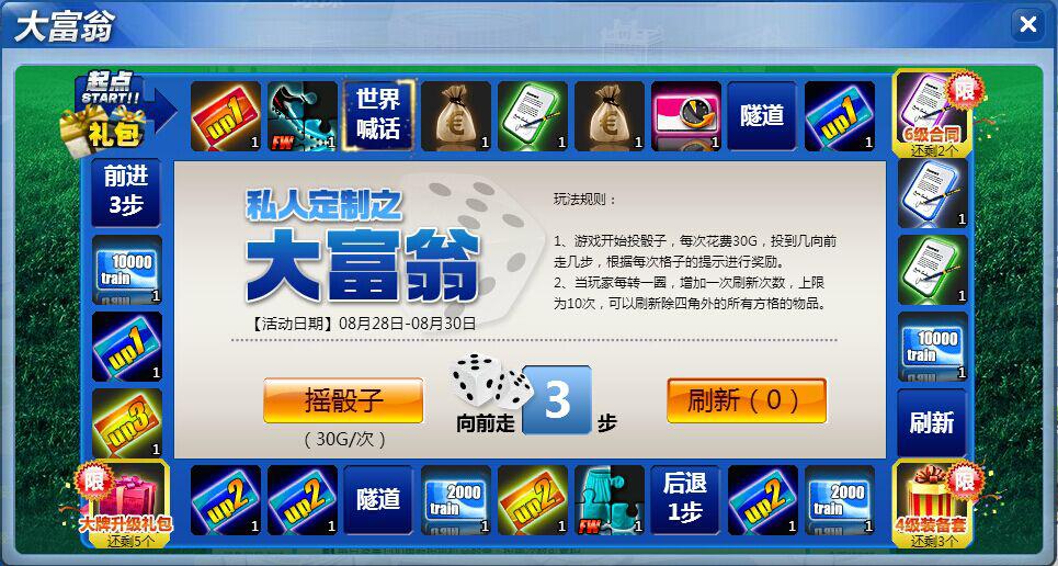 活动内容:在活动期间内,玩家参与私人定制大富翁活动。玩家仅需消耗30金币即可掷骰子前进,骰子显示几点就走几格。私人定制大富翁活动更有全服限量的角落超级大奖在等你拾取~私人定制大富翁何止高大上,好运伴你步步喜,限量豪礼机会难得,快来参与吧!