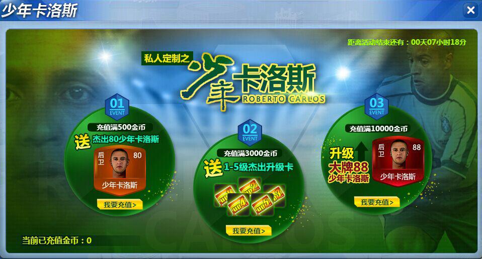 在活动期间,玩家累计充值满10000金币则免费将你获得的杰出品质初始能力80的少年卡洛斯升级为初始能力88大牌品质哟!
