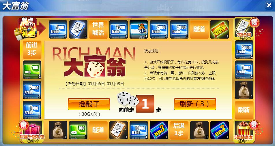 活动内容:在活动期间内,玩家参与私人定制大富翁活动。玩家仅需消耗30金币即可掷骰子前进,骰子显示几点就走几格。私人定制大富翁活动更有全服限量的角落超级大奖在等你拾取~私人定制大富翁何止高大上,好运伴你步步喜,限量豪礼机会难得,快来参与吧!