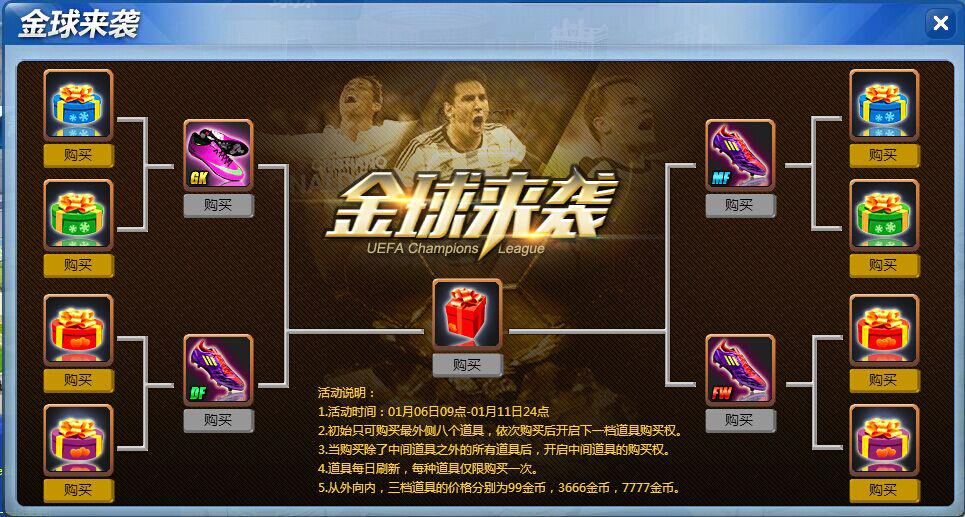 活动内容:新年第一发,金球来袭,你得来一发!在活动期间,玩家在“金球来袭”活动界面中看到证锃明瓦亮的极品道具,这可是《欧冠足球2》从未有过的极品道具钜惠大放送呀!金球来袭玩法简单,就是一个字:买!最低99金币起哟~