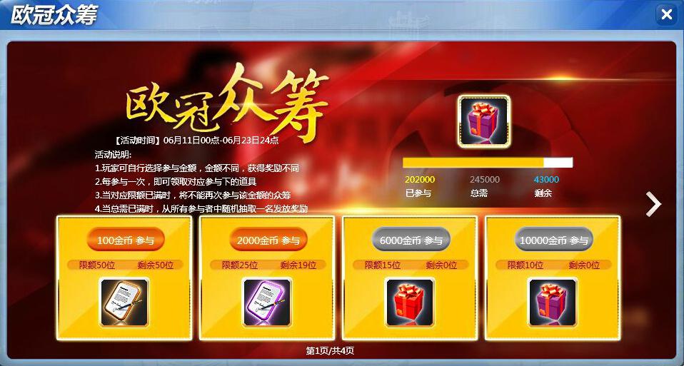 活动内容:在活动期间,一定要来参与“欧冠众筹”活动哟!玩家通过购买相应道具,当筹集金额达标后,从参与本活动的玩家中随机抽取一名幸运玩家发放奖励。