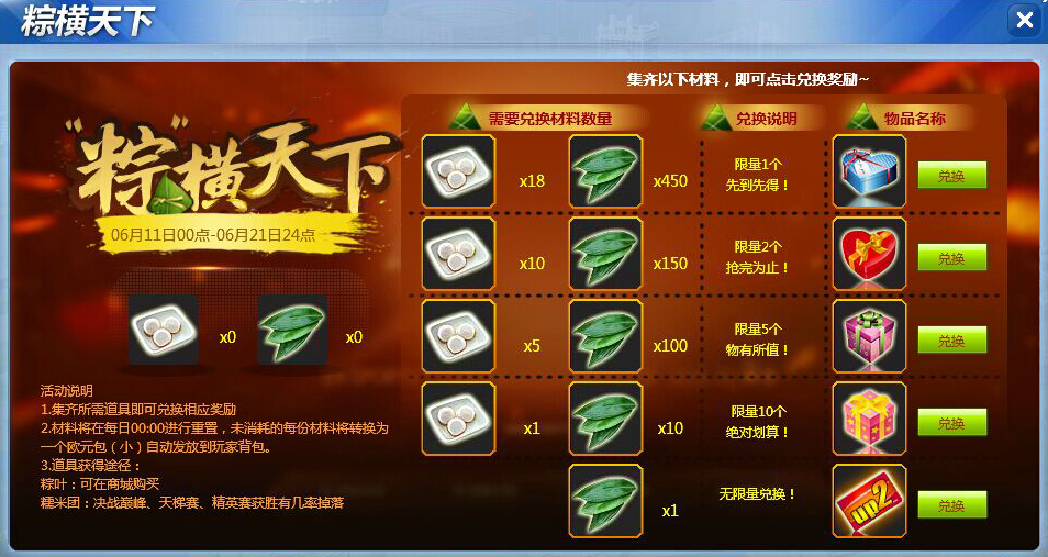 1、活动期间,商城售卖的“粽叶”每片标价10金币。玩家在决战巅峰、天梯赛、精英赛中获胜则有机会获得“糯米团”,集齐相应数量的“粽叶”、“糯米团”可兑换礼包奖励。兑换礼包奖励详情如下: