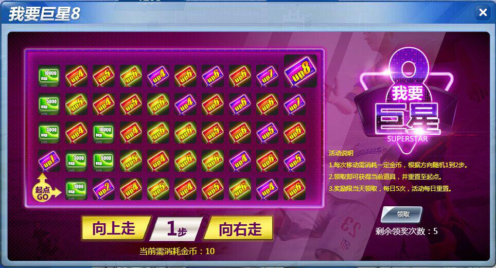 活动内容:在活动期间,我们必须要为球队中的巨星球员做一番大事儿!而我要巨星8活动就是你急需完成的大事儿!在活动界面中,玩家消耗金币选择点击“向上走”或“向右走”,界面中显示几步就走几步,玩家可随时领取驻格内的奖励,若玩家坚持走完全程,玩家在终点驻格领取到终极大奖巨星8级升级卡!轻轻松松帮你实现巨星球员快速提升实力的愿望,好刺激的说,你可一定不要错过呀!
