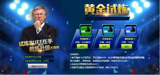 活动内容:在活动期间,一起来参与“黄金试炼”活动!玩家在每个活动日里搜索10次球员后,开启试炼BUFF!在该BUFF有效期内,教练强化获得经验根据球探搜索次数增长,搜索越多则教练强化经验越高!试炼BUFF在手,教练升级不用愁!