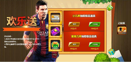 活动内容:活动期间,一起来参与刺激又好玩的“欧冠大转盘”活动!你只需30金币就可以转动一次转盘,转盘停下时则获得指向的道具,其中还有可以用来兑换奖品的金球呢。收集一定量的金球就可以兑换相应的奖品!“欧冠大转盘”活动乐趣十足,好玩极了,快快参与吧!