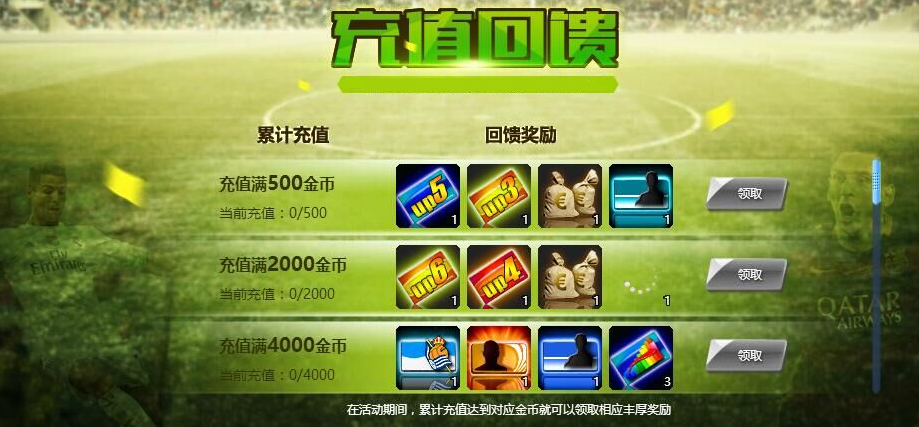 面对挑战,当有豪华道具成为球队胜利的催化剂!充值回馈喜天下,你就是特享者哟~一份份实力豪奖摆上台,想要你就来充值!