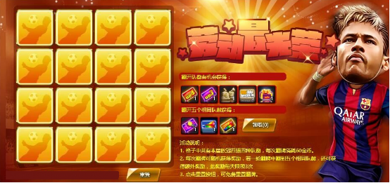 1、在活动界面中,格子内有本届欧冠四强球队的队徽,每次翻牌消耗60金币。每次翻牌可随机获得奖励,若一轮翻牌中翻到5个相同队徽,还可获得额外奖励,此奖励每天限领3次。