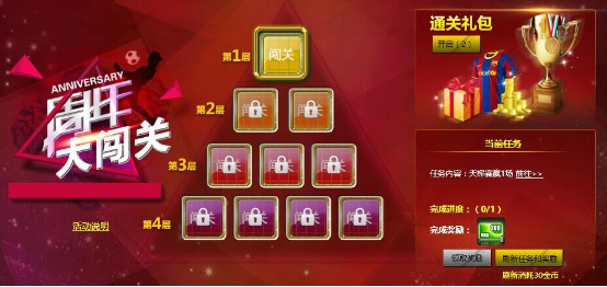活动内容:活动期间,玩家参与“周年大闯关”活动。每一层的方格都内含随机任务供玩家完成,完成任务即解锁点亮一个方格图标并且获得完成任务的奖励。经过一层一层的任务闯关,完成最终闯关者可获得通关礼包,开启通关礼包可随机获得豪华游戏道具!
