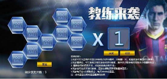 活动内容:在活动期间,玩家参与“教练来袭”活动。玩家花费金币来翻牌,在翻牌后,玩家可选择在抽奖区域花费金币进行抽奖,抽中多少数字就可以领取相应倍数的翻牌奖励。教练来袭,撼天动地,大牌教练卡等你来翻,祝你好运!