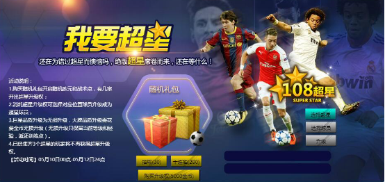 活动内容:在活动期间,玩家参与“我要超星”活动!花费金币抽取随机礼包将有机会获得升级权。玩家选择消耗升级权可选择球队中与超星球员相对应位置的大牌或巨星品质球员升级成为绝版初始能力108超星球员!请不要再错过机会哟,球队会因绝版初能108超星球员的加入而变得更加强大!