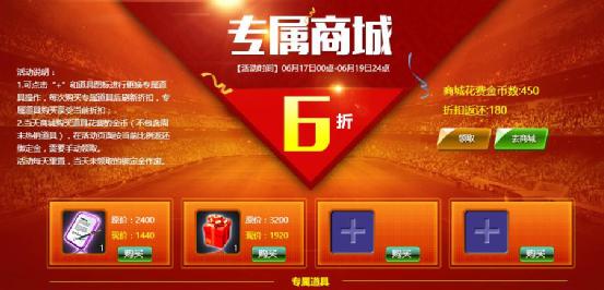 活动内容:在活动期间,“专属商城”掌柜要与您谈笔大买卖!您在此购买专属道具刷新折扣,专属道具享受当前折扣价哟~果然好生意呀!另外,每个活动日在商城内购买常规道具所花费的金币,会在“专属商城”页面按当前比例返还绑定金币!财神当道,恭喜发财!