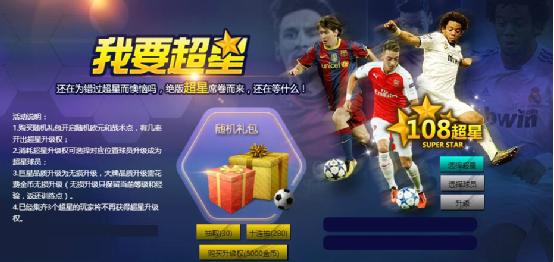 活动内容:在活动期间,玩家参与“我要超星”活动!花费金币抽取随机礼包将有机会获得升级权。玩家选择消耗升级权可选择球队中与超星球员相对应位置的大牌或巨星品质球员升级成为绝版初始能力108超星球员!请不要再错过机会哟,球队会因绝版初能108超星球员的加入而变得更加强大!