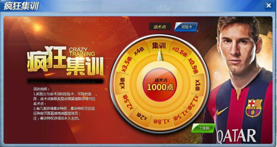 活动内容:活动期间,玩家参与“疯狂集训”活动。玩家通过切换界面上方的经验卡/战术点摇奖盘消耗金币抽奖!若是抽得“集训特权”奖,就可在“无尽远征”阵容页面直接培养图鉴球员哟~本活动与“无尽远征”联系密切,若想轻松远征,那就必须得进行一番疯狂集训哟!