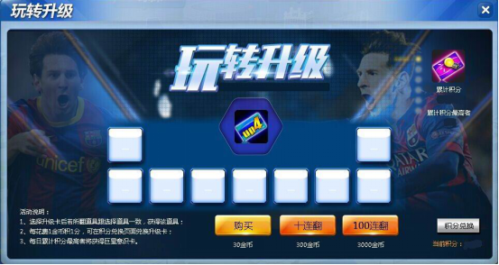 活动内容:在活动期间,一起“玩转升级”喽!活动界面列有9张卡牌,玩家花费30金币翻9张牌,若玩家选择的升级卡与翻牌得出的升级卡一致便能斩获该升级卡!每花费1金币将累计1积分,每日累计积分最高者获得巨星意识卡!