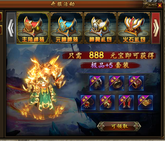 活动详情:活动期间玩家只需花费对应数量的元宝,即可获得极品精美套装。套装包含主角神装、神翼礼包、火石礼包、神器礼包。珍奇好礼,让您体验非一般的游戏感受!