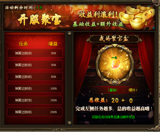 活动详情:活动总共分为五天。等级达到对应条件,即可达成对应任务要求,获得增益加成,收益利滚利,还可以有机会获得额外的收益加成哦,完成任务越多,获得的总收益越高哦!
