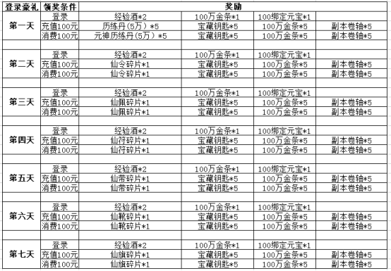 活动详情:活动期间玩家达到登录、充值、消费要求,即可获得仙装碎片、宝藏钥匙、海量金币奖励。