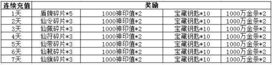 活动详情:活动期间单天累计充值200元,且持续充值天数达到要求即可领取仙装碎片、盾牌碎片、海量神印值、宝藏钥匙、大量金币奖励。