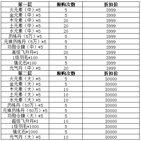 注:第一层--火元素(中)*5的限购次数为0时,即可购买第二层--火元素(大)*5。