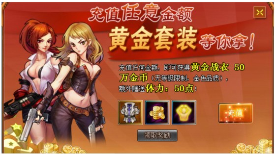 首充礼包内容:风暴上衣(黄金战衣)、50万金币、50体力。