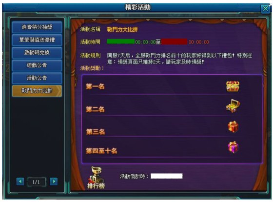 活动时间持续时间内,玩家可在努力提升战斗力,最后结果会在活动最后一天的0点计算出,然后上榜玩家可在此页面中的右下角领取奖励(领奖也面只持续2天,请玩家及时领奖)如果没有出现领奖按钮,请尝试刷新页面。