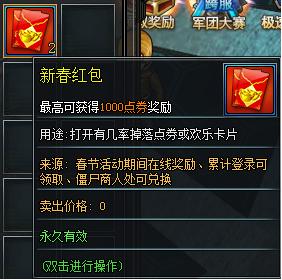 活动内容:开启新春红包有机率获得1000点券的超级奖励;参与在线领奖、累计登录、限时热卖活动可以获得新春红包;