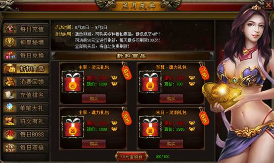 【活动说明】:活动期间,可购买多种折扣商品,全场最低低至4折!可消耗50元宝进行刷新,每天最多可刷新100次!全部购买后,将自动免费刷新!
