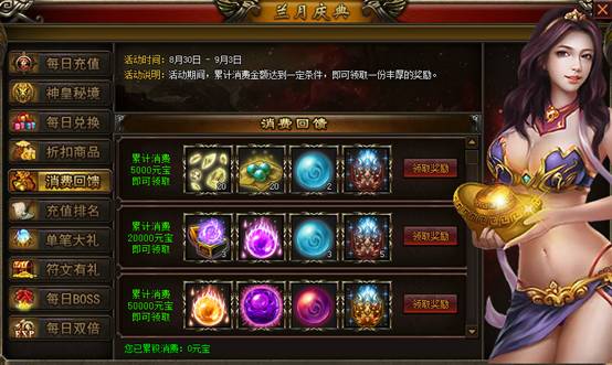 【活动说明】:活动期间,每天击杀怪物获得的符文值达到50000、100000、200000、300000时,即可获得大量的符文值奖励!