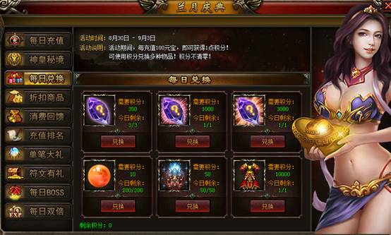 【活动说明】:活动期间,每充值100元宝,即可获得1点积分!可使用积分兑换多种物品!积分不清零!