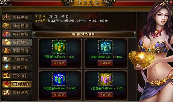 【活动说明】:每日击杀boss数量达到一定条件时,可领取一份奖励!